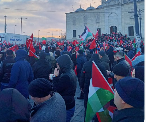 January 1, 2025 morning, Istanbul. The march, which set out with the slogan “We do not cringe, we are not silent, we do not forget Palestine!”, began with morning prayers at nearby mosques. After the prayers, groups moved from the Sultan Ahmed Mosque, Hagia Sophia Mosque, New Mosque, and Süleymaniye Mosque. Groups also joined the march from Fatih and Taksim Mosques. The march concluded at Galata Bridge.