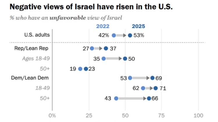 While 37% of Republicans have an unfavorable view, the ratio for Democrats has risen to 66%. Unlike adults over 60 years old, young Americans are considerably against Israel.
