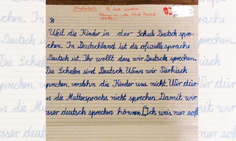 « Parce qu’à l’école, les élèves parlent allemand. La langue officielle en Allemagne est l’allemand. Vous voulez que nous parlions allemand. Les écoles sont allemandes. Les enfants ne nous comprennent pas si nous parlons turc. Nous ne pouvons pas parler notre langue maternelle. Parce que nous devons apprendre à bien parler allemand. »