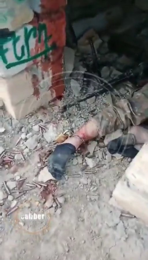 In another video, a dead Armenian machine gunner is seen as chained by his foot to his post.