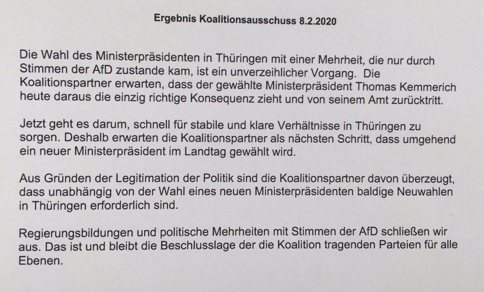 Laut ZDF Heute tagte am 08.02.2020 von 13:00 bis 15:00 Uhr der Koalitionsausschuss im Bundeskanzleramt. In dem um 15:00 Uhr öffentlich bekannt gemachten “Ergebnis Koalitionsausschuss“ heißt es: “Die Koalitionspartner erwarten, daß der gewählte Ministerpräsident Thomas Kemmerich heute … von seinem Amt zurücktritt.“