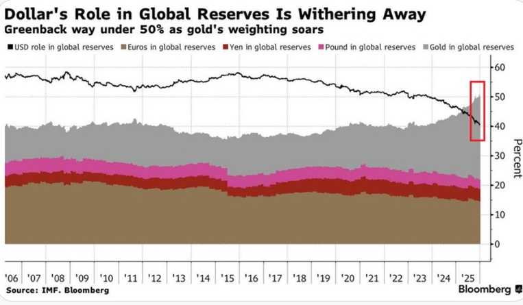 n a striking shift reshaping the global financial landscape, gold has emerged as a formidable contender in central bank reserves, overtaking traditional currency holdings and challenging the U.S. dollar’s supremacy. Recent data from the International Monetary Fund (IMF) reveals that the greenback’s share in total global official reserves has dipped below 50%, while gold’s weighting has soared to over 20%, marking a pivotal moment in the ongoing de-dollarization trend.