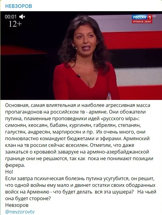 Famed Russian journalist A. Nevzorov mentions an Armenian group as 'the most influential and most aggressive' within the propaganda machine on Russian TV. This omnipotent clan admires Putin and ardently preach for the 'Russian world' idea. pic.twitter.com/CMkzJ8kRCh