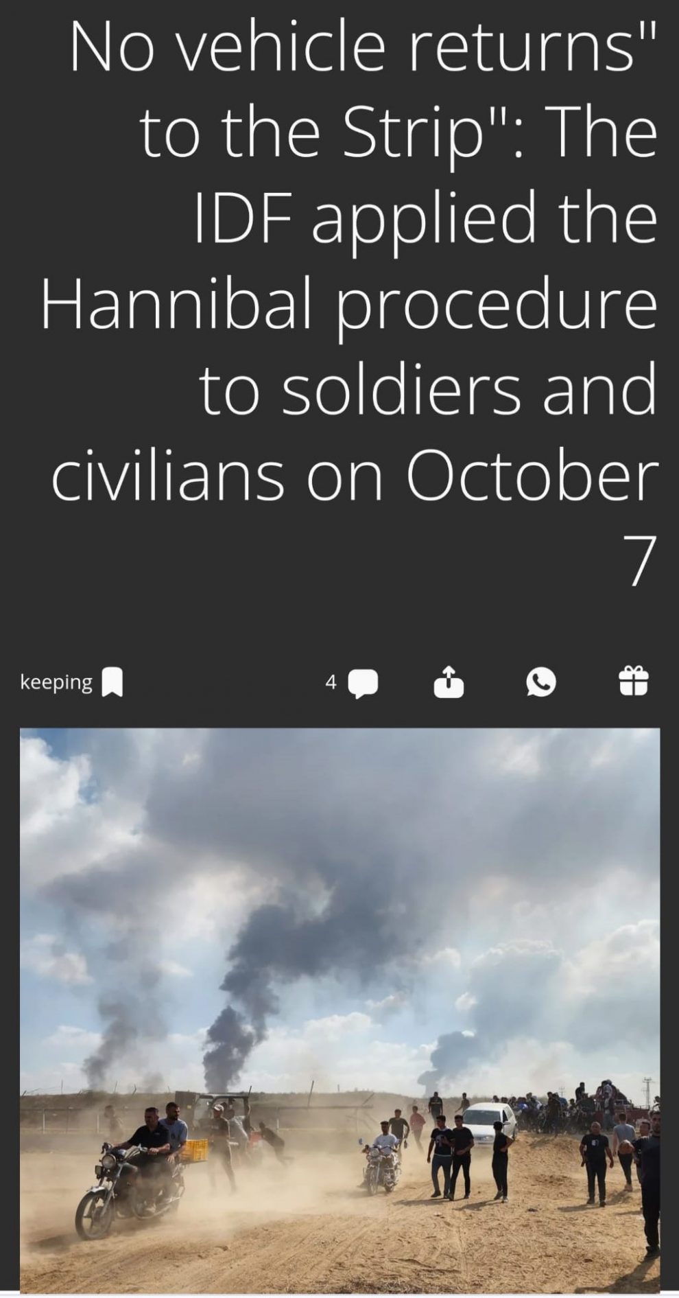 1. It has been my suspicion for a long time that Israel killed a great number of its own casualties on October 7. We know about dozens who died at IDF hands for certain already, but the scale of the use of Hannibal Directive is only gradually coming out.