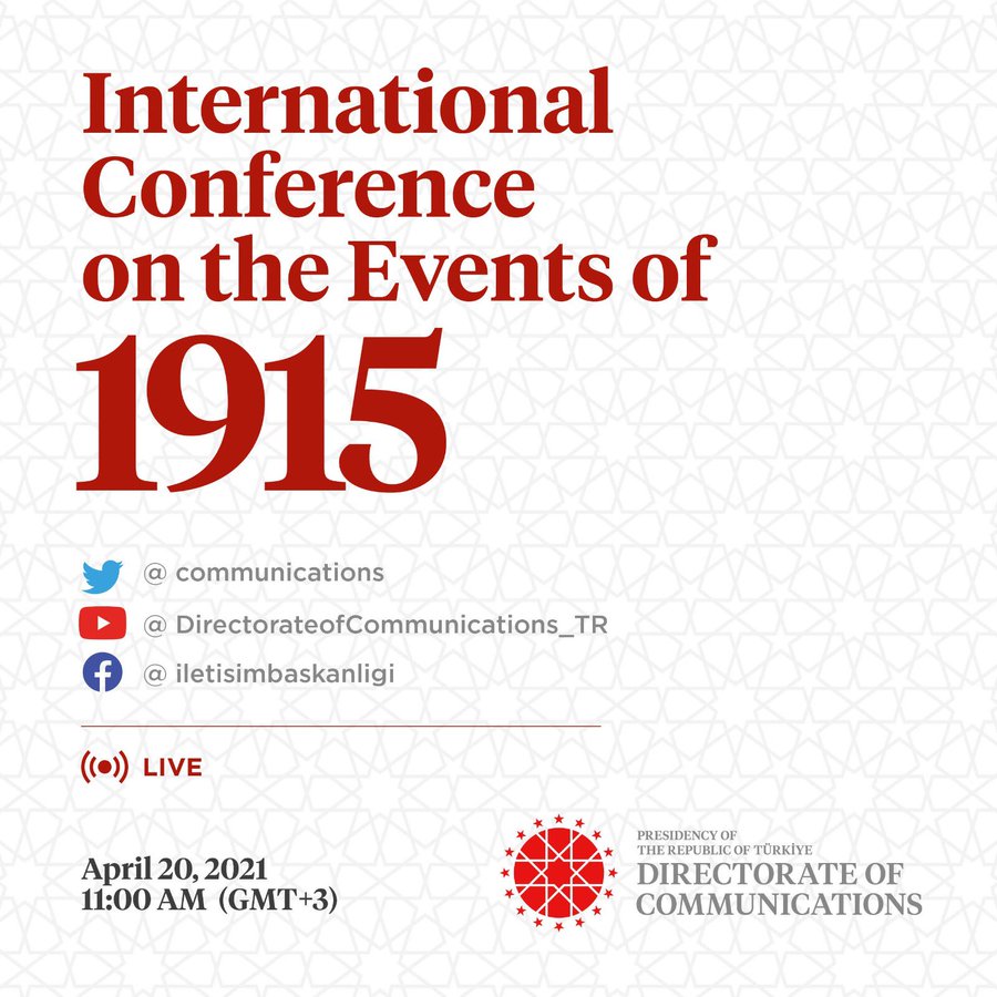 The Presidency of the Republic of Türkiye Directorate of Communications will organize an online “International Conference on the Events of 1915” on April 20, 2021, where it is planned to discuss the historical background, legal aspects, and current reflections of the Events of 1915. Opening speeches of the conference will be delivered by the Director of Communications, Prof. Fahrettin Altun, together with the President of the Turkish Historical Society, Prof. Birol Çetin. The conference will be live-streamed online from the Presidency’s Directorate of Communications’ social media accounts.