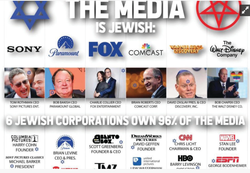 All biggest media companies in great powers located in the western hemisphere are possessed by Jews. It is estimated that 96% of American media is controlled by Jews. New York Times, Wall Street Journal, Time, Newsweek, CNN, Fox and so many other influential companies are owned by Jews.