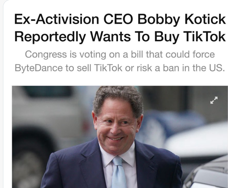 The US congress wants Chinese firm ByteDance to sell its controlling stake of TikTok. There are reports that the likely buyer will be a Jewish businessman, namely Bobby Kotick, who is ex-CEO of Activision. Kotick is reportedly seeking wealthy partners – including #OpenAI‘s Sam Altman – to acquire social video platform TikTok. Kotick had connection with Jeffrey Epstein as well.