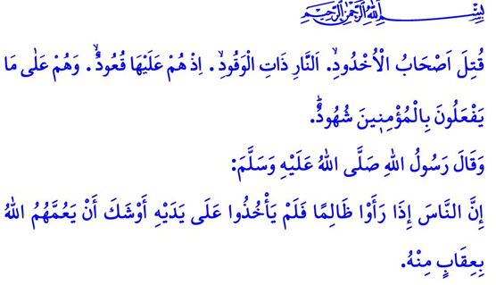In the Holy Qur’an, our guide to life, there are numerous stories filled with wisdom and lessons. One of these is the story of Ashab al-Ukhdud (the People of the Ditch). In the noble verses I recited at the beginning of my khutbah, this tyrannical group is described to us as follows: “Condemned are the makers of the ditch—the fire ˹pit˺, filled with fuel—when they sat around it, watching what they had ˹ordered to be˺ done to the believers, who they resented for no reason other than belief in Allah—the Almighty, the Praiseworthy—˹the One˺ to Whom belongs the kingdom of the heavens and earth. And Allah is a Witness over all things. Those who persecute the believing men and women and then do not repent will certainly suffer the punishment of Hell and the torment of burning.”[i]