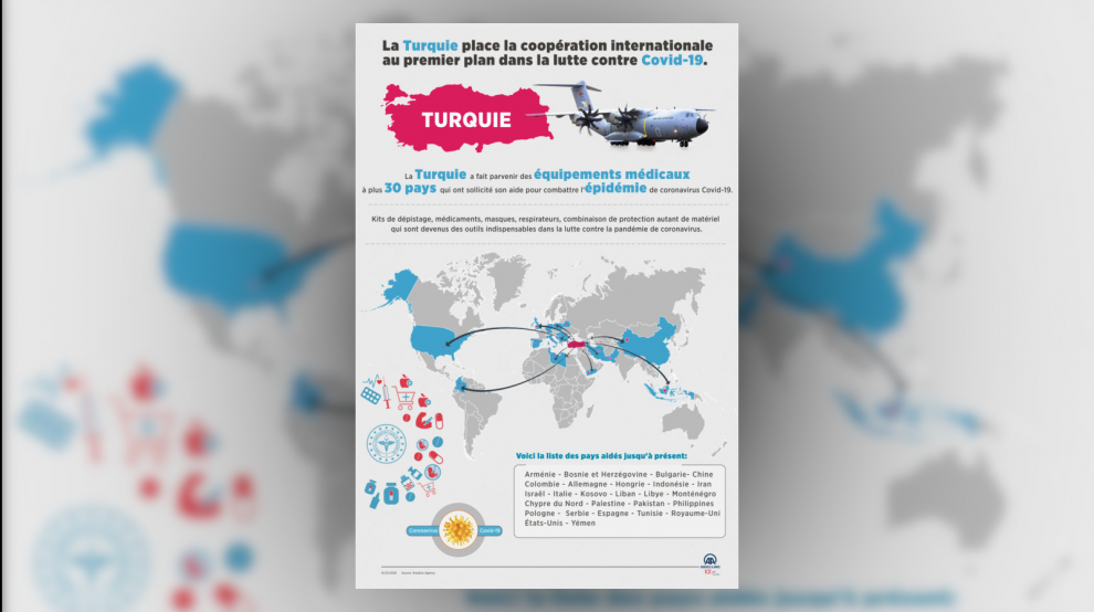Malgré les besoins grandissants sur son propre sol, la Turquie a répondu favorablement aux demandes des autres pays qui l’ont sollicité pour recevoir de l’aide médicale. Par ailleurs, la Turquie avait décidé de distribuer gratuitementdes masques à sa population par un décret présidentiel le 9 avril.