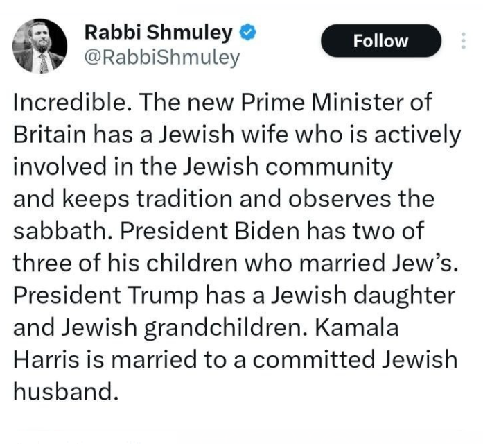 “Incredible. The new Prime Minister of Britain has a Jewish wife who is actively involved in the Jewish community and keeps tradition and observes the sabbath. President Biden has two of three of his children who married Jew’s. President Trump has a Jewish daughter and Jewish grandchildren. Kamala Harris is married to a committed Jewish husband.”