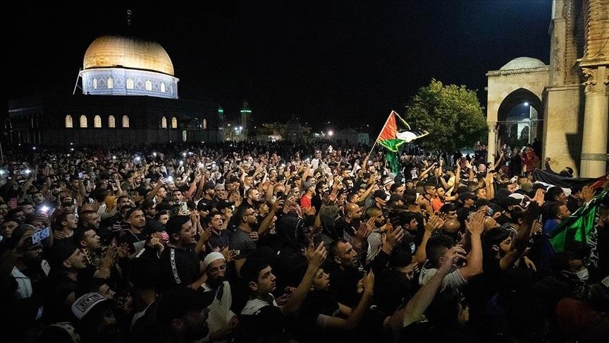 According to an Anadolu Agency photojournalist at the scene, Israeli police, who were waiting outside the two gates, fired plastic bullets and sound bombs at the congregation leaving the compound. Palestinian youth responded by throwing stones and bottles at the police.