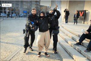Obwohl er den auf zwei Meter Länge ausgestreckten Zollstock in den Händen hält und nutzt, um auf Abstand zu bleiben (Social Distancing!) und eine Atemschutzmaske trägt, wird ein Grundgesetzverteiler von einem Schwarm Polizisten abgeführt und gegen die nächst gelegene Polizeiwanne gedrückt.