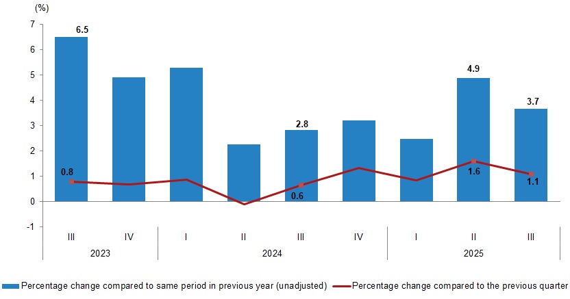 GDP with chain linked volume index (2009=100) increased by 3.7% compared with the same quarter of the previous year in the third quarter of 2025.