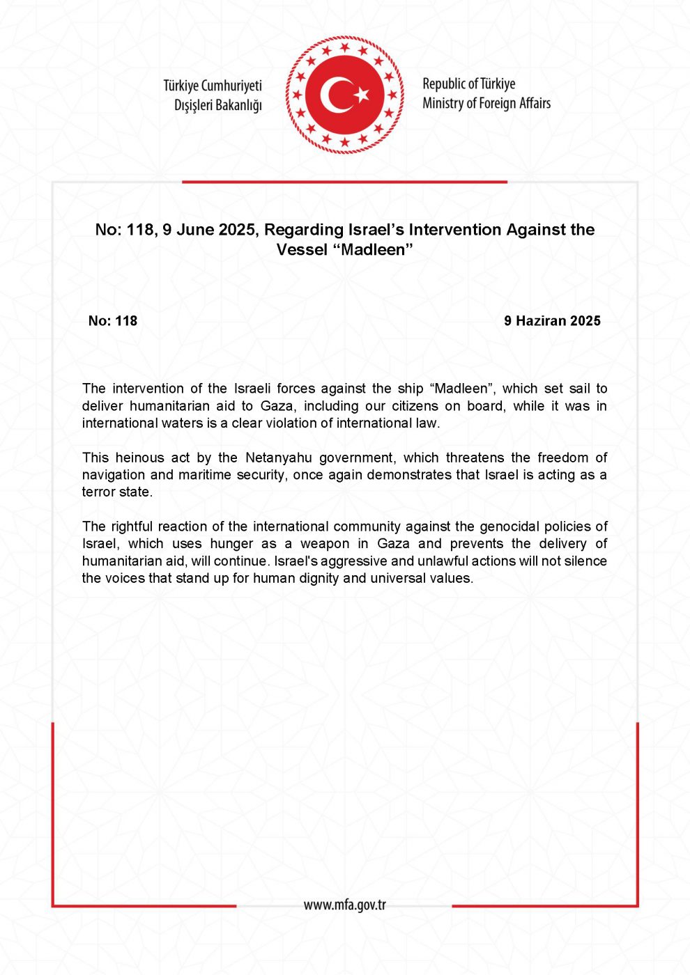 The intervention of the Israeli forces against the ship “Madleen”, which set sail to deliver humanitarian aid to Gaza, including our citizens on board, while it was in international waters is a clear violation of international law.