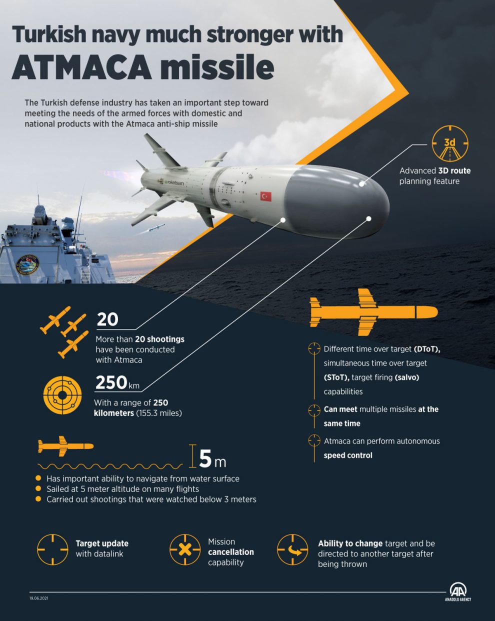 Turkish weapons manufacturer, Roketsan, touts Atmaca as a high-precision, long-range, surface-to-surface, precision strike anti-ship missile which can be integrated with patrol boats, frigates and corvettes and is expected to replace the US-made Harpoon missile.